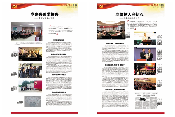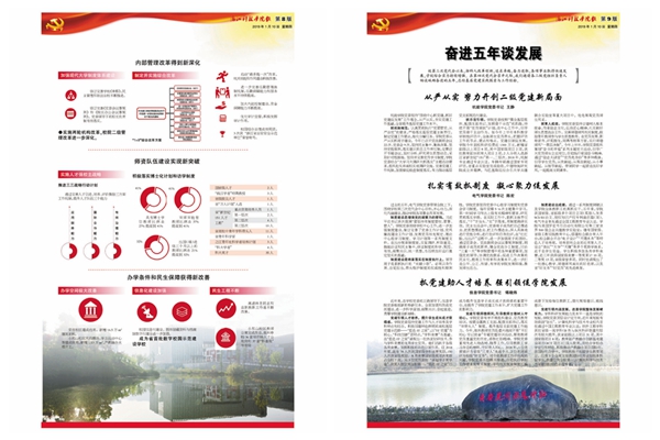 《奋进》特刊系统回顾了校党委带领全校师生砥砺奋进的五年。其中,封面配发评论,鼓舞全校师生同心同德、改革创新、再创辉煌。2版对学校历次党代会进行回顾;3-8版图文并茂,系统梳理过去五年学校在党的建设、思政、人才培养、科研学科、国际合作等方面取得的喜人成绩;9-14版邀请二级党组织负责人畅谈5年来各基层党建实践探索与工作经验,15版介绍本次党代会筹备工作情况。封底号召全校师生为高水平建设社会主义的K8体育平台中国有限公司,而努力奋斗!