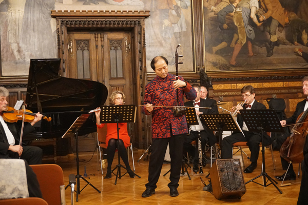 音乐会上,埃尔福特市副市长科诺博利希博士(Dr. Knoblich),埃尔褔特应用科技大学孔院德方院长瓦格纳教授分别致辞,向大家致以新年祝福。演出以中国传统名曲《喜洋洋》开场,把观众们带入喜气欢快的节日气氛中。中国传统曲目《在水一方》《茉莉花》《万马奔腾》《月光下的凤尾竹》《渔舟唱晚》等与西方曲目《西班牙进行曲》《巴赫D大调协奏曲》《欢迎/卡巴莱》《巴尔干》穿插,杜建国先生二胡演奏与莱比锡新沙龙乐团的管弦乐器配合默契,相得益彰,完美演绎出中外名曲的新内涵。整场音乐会曲声悠扬,悦耳动听,观众们如痴如醉,音乐会持续了两个小时,每一首曲子演奏完毕,全场观众都报以热烈的掌声,对演员们精湛的演奏给与肯定;观众们也积极互动,不时合着节拍鼓掌配合,现场气氛热烈欢快。新年音乐会的最后一首曲目——《万马奔腾》将整场演出推向高潮。演奏结束,乐队指挥带领乐队向全场观众齐声送上“新年快乐”的祝福。观众们雷鸣般的掌声经久不息,久久不愿离去。(埃尔福特孔院 周艳文 贾峰昌 孟冬)