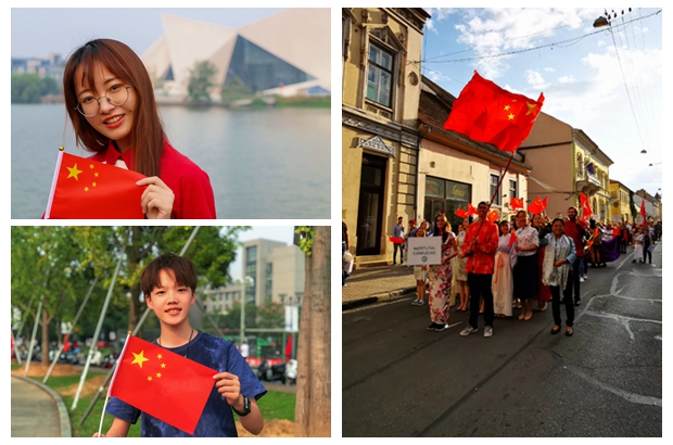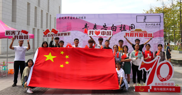 国庆前,学校发起“我和国旗同框”合影活动,引起广大师生积极响应,师生间里掀起一波与国旗合影热潮,大家争相与国旗同框,向祖国表白。水晶剧院、中德楼、西蜜湖、银杏广场、图书馆等地瞬间成为校园最热门的打卡地点。在德国、罗马尼亚、泰国留学生和孔子学院教师也发回了自己与国旗同框的照片。(学生记者 夏黄浩、郑忻宇、楼阳洋、方萌、张之怡、苗珍琦、杨瑜彤、郭佳敏、孙立峰、孙寅、费洋、赵晓雨等 摄)