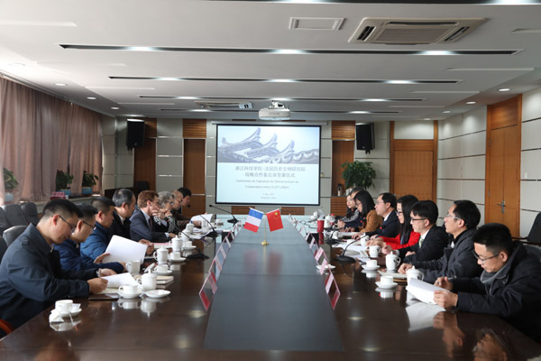 签约仪式前,浙江省文化与旅游厅党组书记、厅长褚子育和校党委书记龚建立一同与法国驻华大使馆环境、遗产和可持续发展处科技合作专员Matthieu BERTON和法国历史文物研究院院长Aline MAGNIEN进行了会谈。褚子育听取中法合作双方在建筑遗产保护领域的合作意向与计划,鼓励中法双方可以从科学研究、学术交流、人才培养和科技服务等方面开展深入合作,并表示将全力支持筹建“中法建筑遗产保护研究院”。