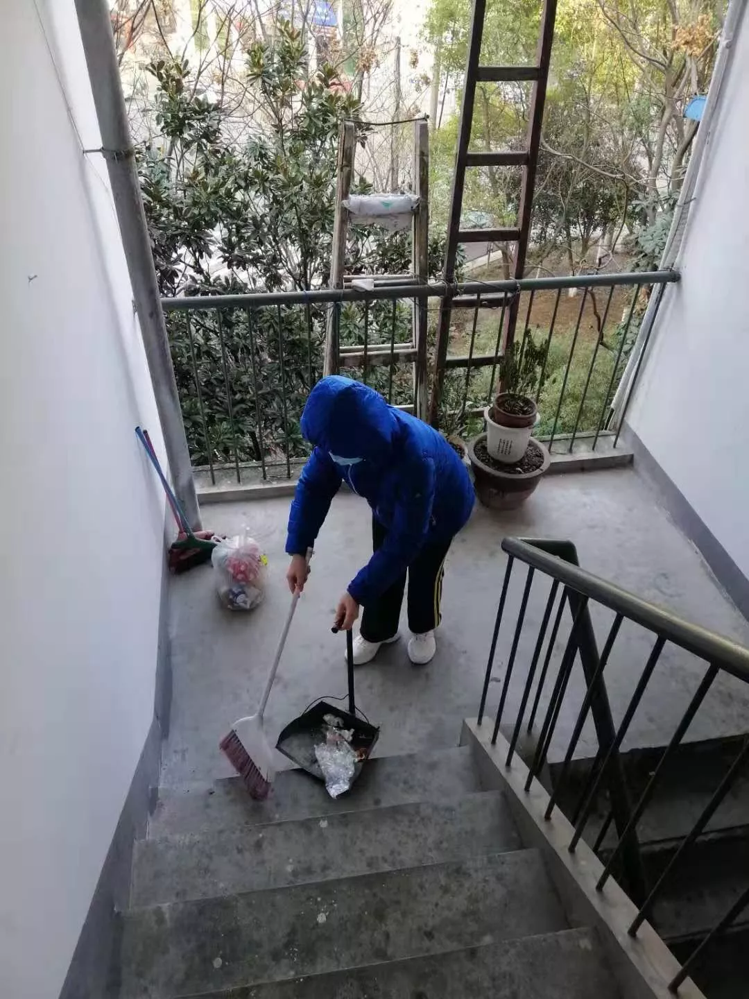 (宋眉在楼道清理垃圾)
