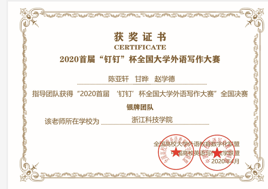 近日,历时3个月的2020 年首届“钉钉”杯全国大学外语写作大赛落下帷幕,全国3000多支高等院校团队进行线上角逐,最终60个团队荣获金、银、铜奖项。我校外国语/中德学院师生获得“银牌团队”称号,自动化类194陈王蓉等12名学生获得决赛优秀作品奖,陈亚轩、甘晔、赵学德获决赛优秀指导教师。