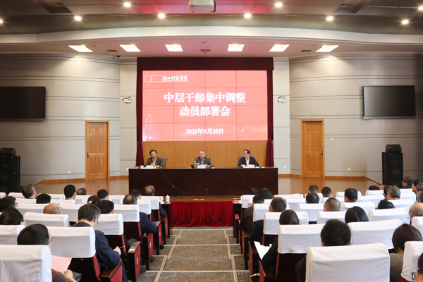 3月25日,学校召开中层干部集中调整动员部署会。校党委书记龚建立作动员讲话。校党委副书记符宁平作具体工作部署。会议由校党委副书记、校长赵东福主持。