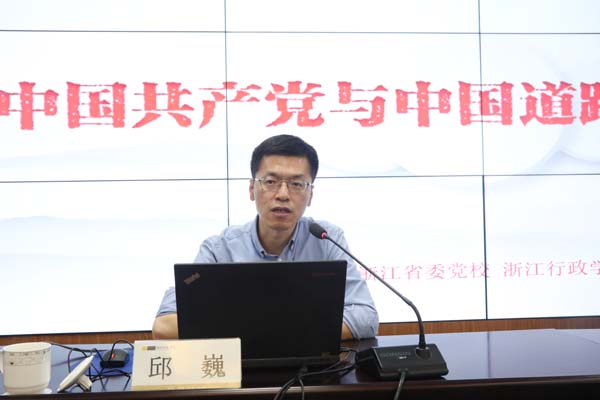 “中国共产党百年历史,是对中国道路的伟大探索的历史。”在题为《中国共产党与中国道路的百年探索》的报告中,邱巍通过中国共产党党史与中国道路探索相结合的主题视角,从“党与新民主主义革命道路、党与社会主义革命和建设道路、党与中国特色社会主义道路、中国特色社会主义进入新时代”四个方面,生动解读了中国共产党团结带领中国人民走过的波澜壮阔而又艰难曲折的奋斗历程、实践创造、历史经验和辉煌业绩。