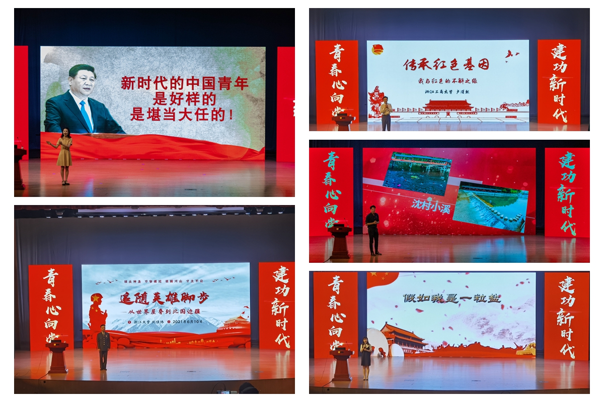 来自浙江省共青团党史学习教育宣讲团的四位成员和我校辅导员代表依次进行了饱含深情、富有感染力的演讲。浙江工商大学刘骊珠的思政课《让青春永续的力量》,生动讲述了一位位学生坚定理想信念,勤奋好学、励志成才的故事,讲述了身残志坚的学生自强不息、顽强拼搏的故事,正是因为不变的信念,不变的拼搏和不变的追寻,青春得以永续。杭州师范大学刘华章的思政课《土地“活”了,农民“富”了——关于“农-地”问题的萧山答卷》,通过展现百年来中共领导下萧山农村土地从“地少农穷”到“地‘荒’农富”再到“地美农富”的经典故事,为我们展现中国共产党领导下农民迈向幸福的历史路程。西藏军区某部边防连服役的退役大学生士兵、浙江大学硕士研究生刘佳玮的思政课《追随英雄的脚步—从世界屋脊到北国边疆》,深情讲述了他大学入学后主动申请到西藏边防服役、在英雄的连队中保家卫国,返校复学后自己的所思所悟所想,更加坚定了其毕业之际再次奔赴内蒙古、一生扎根边疆的信念。浙江工商大学的本科生卢潇然的思政课《传承红色基因—我与红色的不解之缘》,他以在对越自卫反击战中牺牲的舅舅的事迹为主线,以“传”“承”两部分动人阐述了红色基因的传承过程,带领听众感受不灭的红色之火,体悟共产党人精神的代代传承。我校辅导员来雪琦的思政课《假如我是一粒盐》,生动讲述红军将领张子清舍身献盐和妇女委员聂槐妆巧计送盐的英雄事迹,表达了作为新时代的青年,要不忘初心,在党史这部浩然长卷中汲取信仰的力量,一起成为复兴路上的那一粒盐,用忠诚和担当书写属于我们的青春华章。