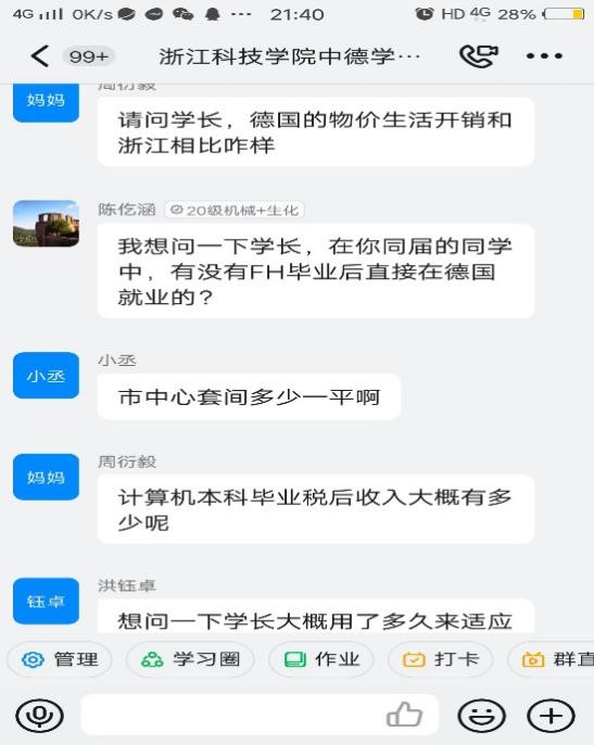3次活动中,“2+3”项目毕业生范成、徐同禹、邢鑫分享自己申请德国慕尼黑工业大学、斯图加特大学、布伦瑞克工业大学硕士学位的经历和读硕的体会;施素素分享自己获德国DAAD外国留学生奖学金的经验;2018级德福考试高分考生陈张婷、陈羽寒、李夏晴分享自己的备考经验;2017级德语专业陈子轩、季畅宇,分别介绍自己考取浙江大学、上海外国语大学硕士研究生的经验,在钉钉直播间参活动的同学,围绕自己关注的重点,面临的困难、困惑等具体问题跟学长学姐们进行虚心请教和深入交流。