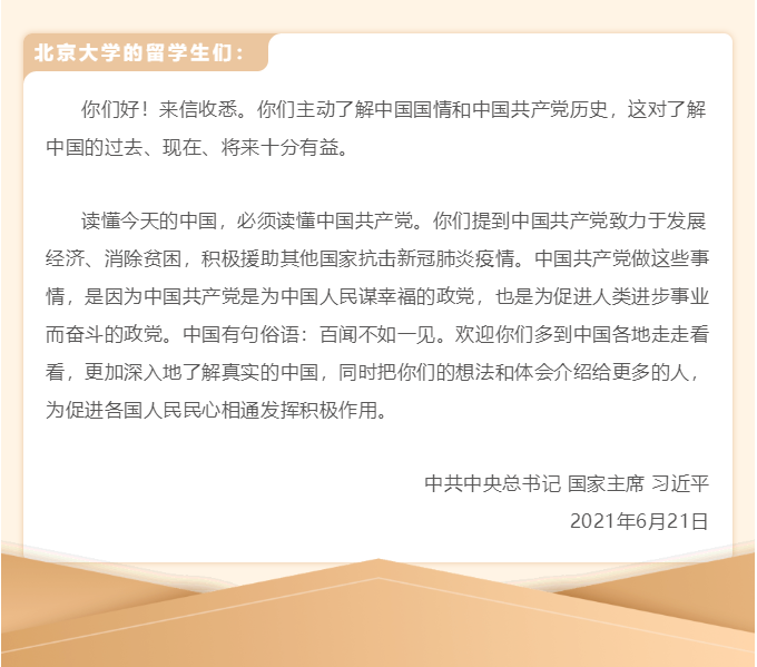 6月21日,中共中央总书记、国家主席习近平给北京大学的留学生们回信指出,读懂今天的中国,必须读懂中国共产党,他勉励留学生们更加深入地了解真实的中国。习近平主席的谆谆话语和殷切期望,在我校师生中引起了强烈反响。