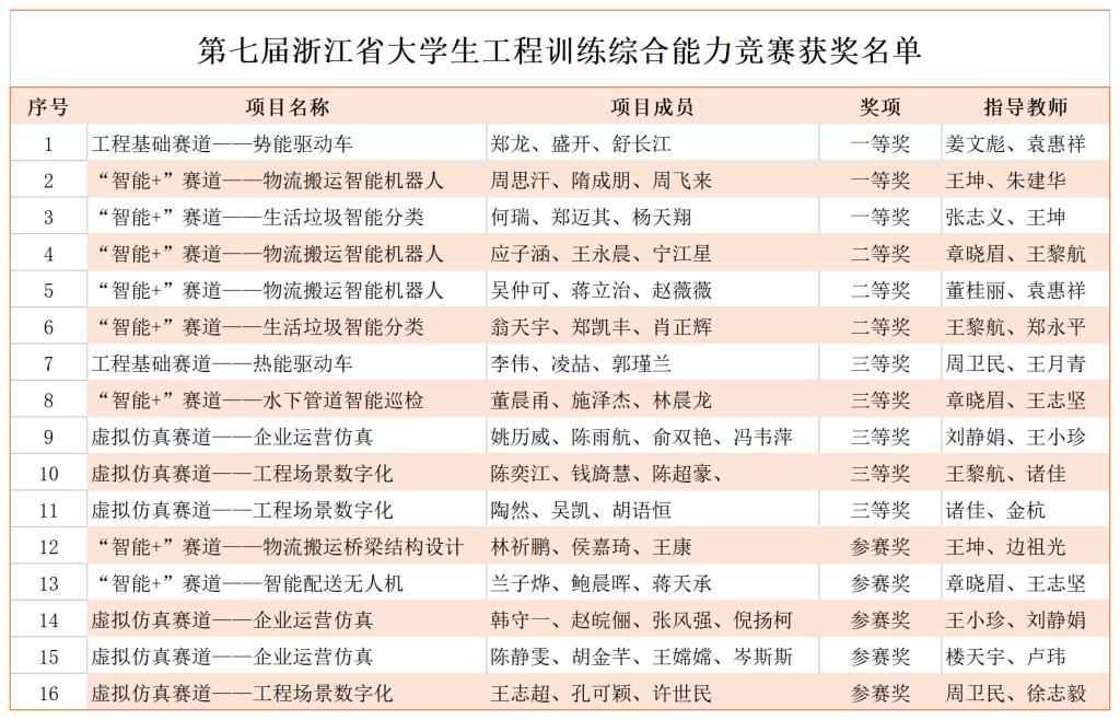 日前,第七届浙江省大学生工程训练综合能力竞赛暨第七届全国大学生工程训练综合能力竞赛浙江省选拔赛结果发文公布,我校参赛队伍获得一等奖3项、二等奖3项、三等奖5项目、参赛奖6项。