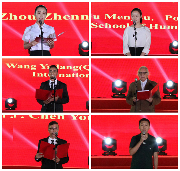 新生家长陈有江勉励孩子们融入科院,勤勉好学,收获成长。新生本科生代表英语专业周振男和新生研究生代表汉语国际教育顾梦苏分别上台发言,表示在今后的学习中将努力提升自我,明确目标,实现理想。老生代表、也门籍留学生王亚以自己的切身经历告诉全体新生,大学的主要任务是多学习,多实践,多锻炼。
