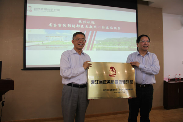 在认真听取工作汇报后,来颖杰为政务新媒体研究院授牌,并做重要讲话。他对研究院前一阶段所开展的工作和下一步工作思路等给予肯定。他强调,研究院要明确定位,坚持研究为本,要着眼政务新媒体发展规律、应用、技术等的研究,努力做实做新做出成果;要坚持服务为重,为浙江政务新媒体发展服务,更要为省委省政府中心工作服务、为浙江经济社会发展服务;要坚持创新为要,以创新思路开展研究与实践,为政务新媒体发展带来内容、技术、机制等的创新。来颖杰指出,研究院要继续加强自身建设,要瞄准需求,对接社会经济发展、对接省委省政府中心工作、对接省委宣传部重点工作、对接各部门各行业发展要求;要集聚资源,联动校内各学科和校外各界资源,发挥各自优势,实现资源贡献共赢;要开展人才培养,建立强有力的师资库、设计有针对性的课程,服务我省政务新媒体和新闻发布队伍水平提升;要有序拓展,在做好政务新媒体研究的同时积极争取拓展空间,做强研究院。就研究院2016年工作,他也给予了指导。