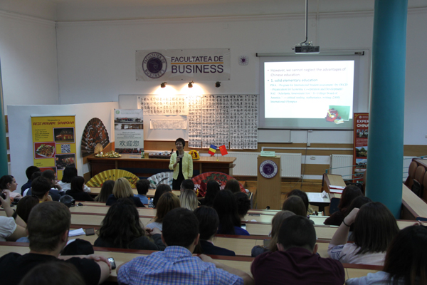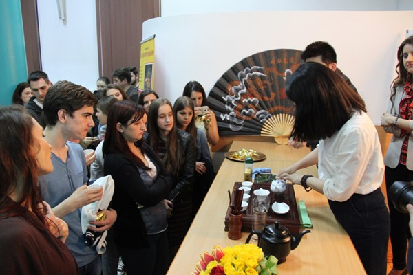 克鲁日孔子学院潘飞院长结合自己从事教育工作的体会以及在罗马尼亚工作、生活的经历,重点介绍了中、罗两国文化与教育体制的差异。并对中国教育海外合作的重要成果---孔子学院以及孔子学院语言与文化课程设置和奖学金项目进行了详细介绍。张君老师为商学院学生介绍了商务社交礼仪和中国商业活动的文化内涵。邵乙超老师为大家进行了中国茶艺展示,大家一边品茶一边就自己关心的中国问题向老师们进行咨询。