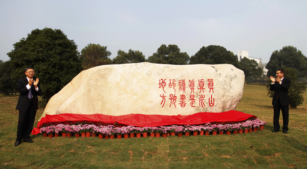 景观石正面用篆体镌刻的“真山真水,真是读书好地方!”一句,出自全国人大常委会委员长张德江视察我校时赞誉,景观石于今年10月完成字体镌刻,将成为学校文化校园的一道新景观。
