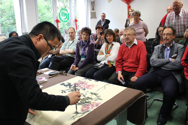 近日,埃尔福特孔子学院举办书画印展览。本次展览中的书画作品由魏玛包豪斯大学研究生杜俊立老师和德国东亚协会主席蕾娜•莫尔女士创作完成,篆刻作品由孔子学院志愿者教师李治创作完成。展品从书、画、印三个不同的角度阐述了中国艺术之美,吸引了埃尔福特广大市民及图林根州其他城市中华文化爱好者前来参观。
