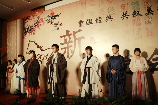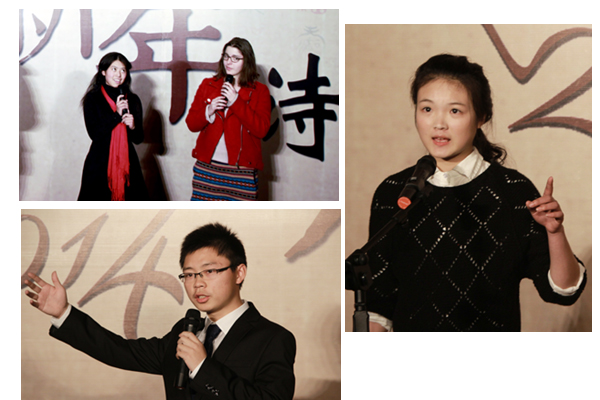 为纪念毛泽东诞辰120周年,同学们特意准备了毛泽东的三首作品《沁园春•雪》、《卜算子•咏梅》和《沁园春•长沙》,叶子瑜、陈珊、柴凯凯三位同学声情并茂的演绎,让我们领略了一代伟人博大的胸襟,还有他崇高优美的革命感情、遒劲伟美的创造力量、超越奇美的艺术思想和豪华精美的韵调辞采。校广播台的集体朗诵《你的祖先名叫炎黄》将晚会推向了高潮,也为2014新年诗会画上完美句号。