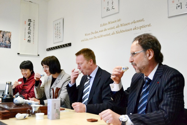 毕玫介绍了孔子学院成立一年多以来的发展运行情况。就孔子学院取得的成绩和运行中需要解决的问题,马奇一行与孔子学院进行了交流。马奇对孔子学院为中德合作做出的贡献给予高度赞赏,并表示对今后加强图灵根州与中国及浙江经济文化教育交流充满期待和信心。交流在孔院特别准备的茶艺表演中进行。