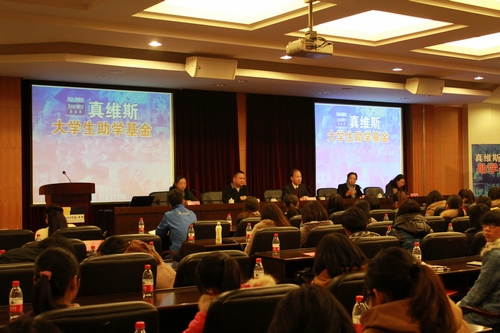 刘申康先生介绍了几年来“真维斯大学生助学基金”项目的实施情况,并做了公开课,他表示真维斯公司会继续践行“捐资助学”的信念和“在有能力的时候去帮助别人”的企业文化理念,希望同学们树立回报社会传递爱心的美德,让所有人携手为爱出发。