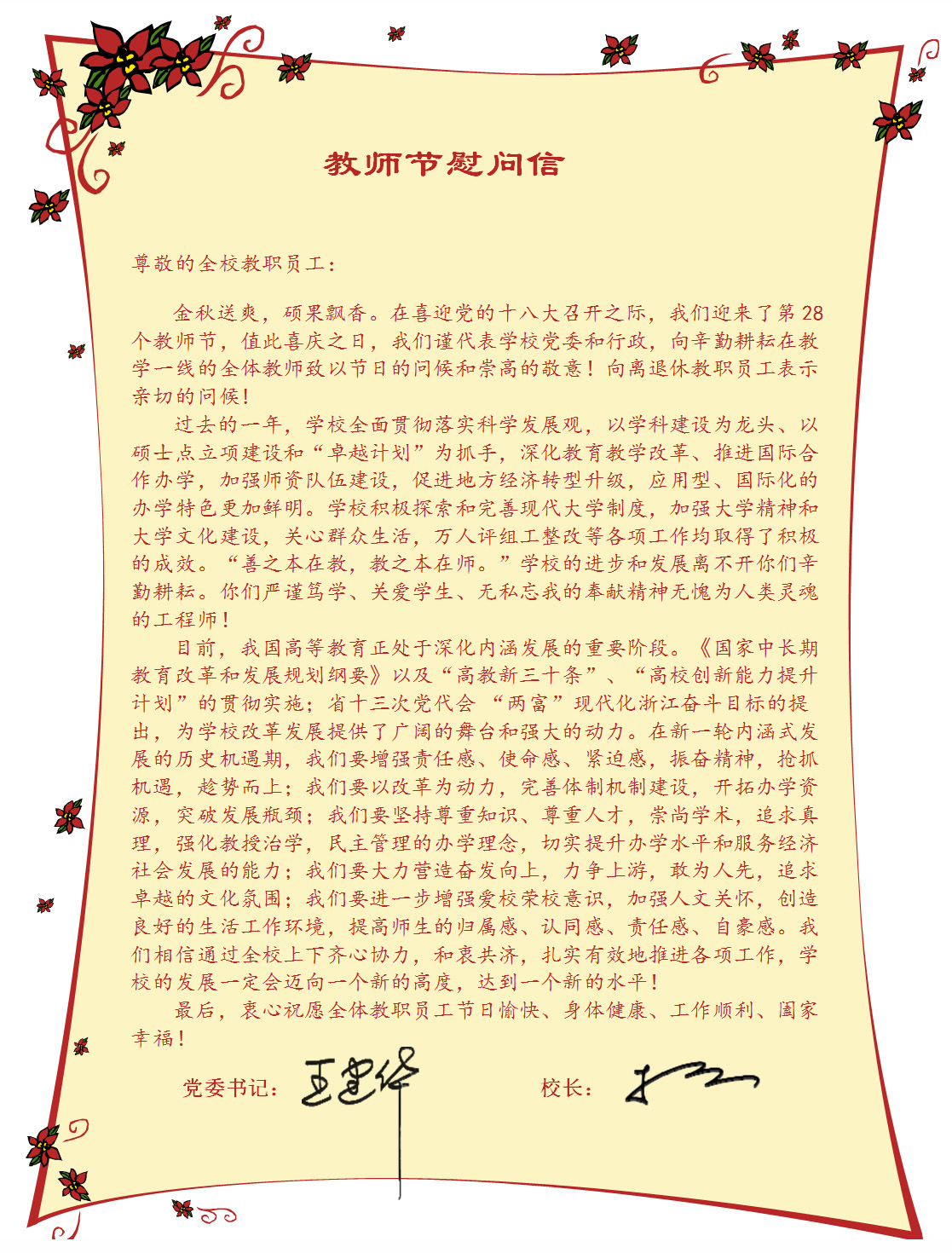 第28个教师节致全校教职工的慰问信