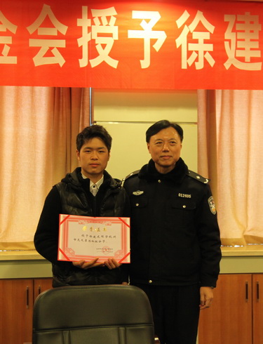 3月23日,机械学院大四学生徐建龙被授予杭州市“见义勇为积极分子”荣誉称号。当天,颁奖仪式在我校举行。杭州市见义勇为基金会秘书长姜建生为徐建龙颁发了奖状和奖金。