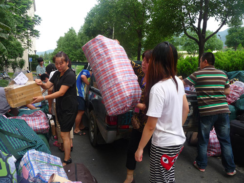 1日是学生搬迁工作最后攻坚的一天,近四百名听松公寓女生搬迁至西和11号楼,当天又气温骤升,后勤公司党总支组织40余人的突击队,党员干部带头与员工冒酷暑,现场组织搬运近两千份行李。搬迁过程中,各部门相互配合,各支部党员发挥先锋模范作用。公寓中心主任程秀阁,不顾腰间椎盘突出,顶着伤痛,参与组织搬迁工作。后勤机关党支部书记贺凡带领机关党员一直奔波在搬迁一线,祝翠珍、宁丽元等女同志手都磨出了血泡。陈文鑫、方明放、潘永飞 等年轻党员、入党积极分子抢在前头。汗水湿透衣背,皮肤晒得通红,大家没有停歇,一趟趟、一件件,将所有行李搬运到位。