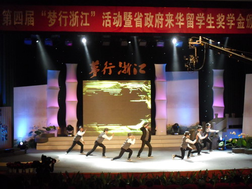 由浙江省教育厅主办的第四届“梦行浙江”外国留学生中华才艺展演暨“浙江省政府来华留学生奖学金”颁奖活动日前举行。浙江省委教育工委副书记、省教育厅副厅长蒋胜祥,、省委宣传部副部长兼省政府新闻办公室主任吕建楚及浙江省各高校的相关领导等出席活动。几内亚留学生Cisse代表我校22名获得“浙江省政府来华留学生奖学金”的留学生上台领奖。