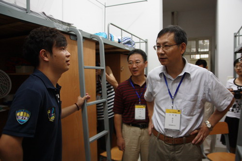 在寝室,校领导与新生亲切交谈,了解他们到校后的感受。校党委书记徐志平叮嘱新生,要认真规划四年的大学生涯,过好生活关、学习关,做一名“学以致用,全面发展”的合格大学生。今年我校新生中有近百名少数民族同学,分别属于16个民族,走访中,每逢遇上少数民族同学,校领导都仔细询问他们的民族风俗,了解他们的生活要求,校领导叮嘱后勤部门,要尊重少数民族同学的生活习惯,照顾好他们的饮食、起居等。对来自甘肃、四川等灾区及灾区周边的同学,校领导鼓励他们自强自立,要相信学校、老师和同学会尽力帮助他们。遇到还没离校的新生家长,校领导向他们介绍了学校情况,告诉家长,学校每一名教职工都会把学生当作自己的孩子一样对待,请家长放心。
