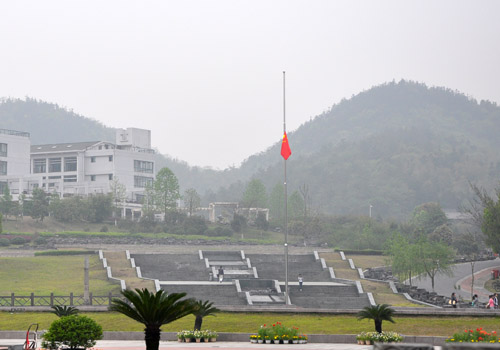 一早,和山广场上国旗降半旗志哀。前往教室上课的同学在银杏广场停下匆匆的脚步,在祭奠区为地震遇难同胞献上一支鲜花。
