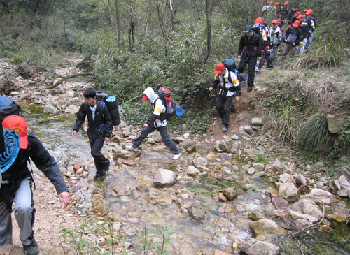 4月3日、4日两天,参加《野外生存生活训练》实践课程的30多名同学,肩背重重的登山包,头戴登山帽,身穿登山服,脚蹬登山鞋,两天时间完成公路拉练、负重丛林匍匐前进、密林绳索岩降、背包涉水行军、野外宿营、云梯摆渡等科目的训练。