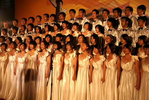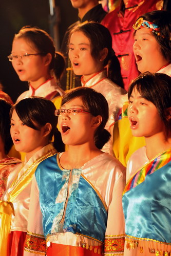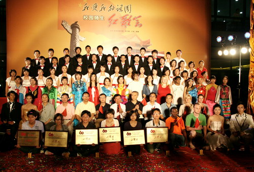 《今天是你的生日》《我的中国心》……深情的演绎表达了师生对新中国60华诞的祝福,《游击队歌》《弹起我心爱的土琵琶》……红色经典歌曲把人们带回到60多年前的峥嵘岁月;《中国朝前走》《在灿烂阳光下》……优美动听的歌声唱出人们的美好新生活。各学院方队和教工合唱团、红蜻蜓大学生合唱团用一首首歌曲为祖国母亲接力送祝福。外国留学生代表唱起《茉莉花》,带来对中国的祝福;少数民族学生们用《爱我中华》表达了他们对祖国母亲的爱。歌咏会现场高潮迭起,精彩不断。