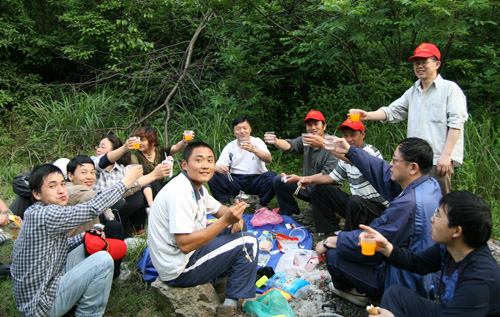 本次活动的攀登目标是午潮山最高点。会员们兴致勃勃地沿着小溪,走在仅能容下一个人通行的羊肠小道上,一路上听着潺潺流水声,感受清新自然景,互相搀扶,相互帮助,每个人都尽情地享受着集体的温馨和包容。登到山顶四处眺望,一幅幅精美的画卷尽收眼底,人们欢呼雀跃,不约而同地高呼“奥运加油!”“北京加油!”