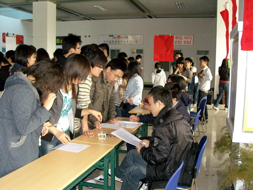 3月27日下午,第四届勤工助学双向选聘活动举行。选聘现场火爆,各二级学院、图书馆和相关职能部门为在校生提供了1500多个勤工助学岗位。本次选聘继续为经济困难 学生开通了“绿色通道”,持卡者优先参加选聘和录用。参与这次双向选聘的还有18家校外企业,他们提供了近百个岗位招聘实习生和兼职人员。