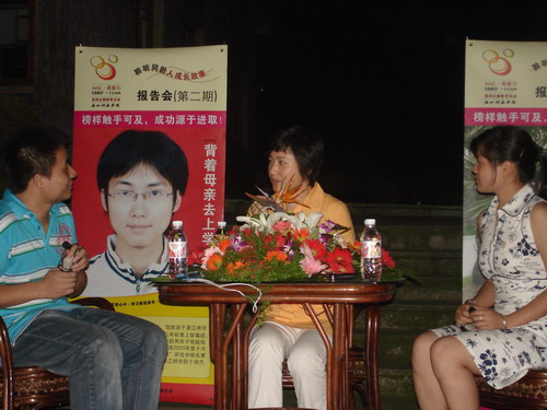 本场报告会以访谈的形式在户外进行,“背着妈妈去上学”的浙江林学院学生刘霆和勤奋学习自信面对生活的我校电气学院毕业班学生诸葛奕敏在报告会上讲述了他们的成长故事。