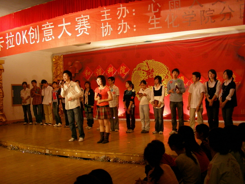 4月15日晚,由生化学院分团委主办,心雨人文协会承办的主题卡拉OK创意大赛隆重举行。来自生化学院各班级的12组选手参加了比赛。老师们也赶来和学生共唱欢歌。