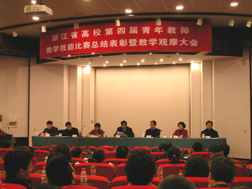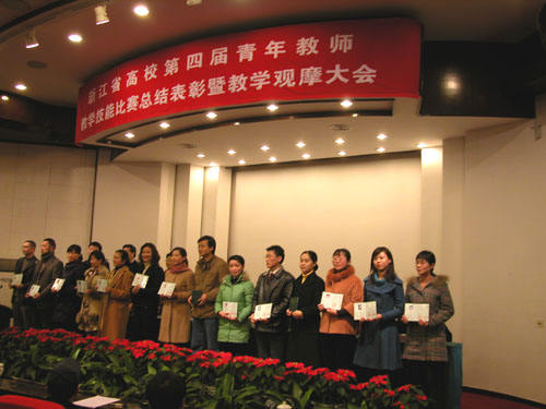 浙江省高校第四届青年教师教学技能比赛总结表彰暨教学观摩大会于2006年12月30日在浙江大学玉泉校区邵科馆报告厅隆重召开。来自全省各高校的青年教师代表、分管校领导和高校教务处、工会负责人及各市教育工会主席参加了大会。我校党委书记徐志平、教务处长冯军、工会副主席苗红亚和受表彰的3位青年教师出席会议。省委教育工委副书记、省教育厅副厅长沈敏光代表高校青年教师教学技能比赛组委会,结合本届比赛工作总结讲话,省总工会副主席姚炳甫出席会议并讲话,东道主浙江大学党委副书记王玉芝,省总工会常委、经济部部长张彤和省教育厅高教处处长方永平、省教育工会副主席陈勇等出席会议并为获奖的青年教师代表颁奖。会议由省教育工会主席秦素琴主持。大会表彰了我校严永仙、魏培莲、黄竹也等147名获浙江省高校第四届青年教师教学技能比赛优秀奖的青年教师。