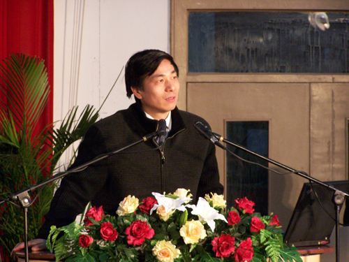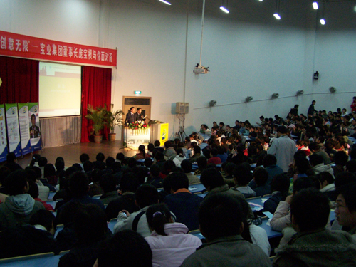 随后是庞宝根的演讲,从商多年的他一开始就语出惊人“中国到底有没有企业家?所谓的‘企业家’称为‘生产管理者’似乎更为稳妥”。谈到宝业,他说“宝业围绕着“企业•市场•社会”的企业文化核心,将股权社会化并成功在香港上市,如今的宝业已经不是宝业的宝业,而是世界上持有宝业股票的股民的宝业。谈到自己的企业及所在行业,他首先介绍了国内外建筑产业市场现状,分析了今后我国建筑产业的发展方向——建筑工业化。他说,资源有限,创意无限,中国建筑业不改变是没有生命的。降低成本、节能环保是中国建筑的前进方向,工业化、工厂化、商品化是中国建筑产业的发展趋势。宝业将秉承“守诚以薄己,取信而厚人”的经营理念,以鼠标加水泥,以科技创新,以智能化和环保节能技术来实现传统建筑业由建造到制造的提升。而对于莘莘学子,庞宝根的寄语是“企业定位准确才能发展,大学生定位准确才能成才”。