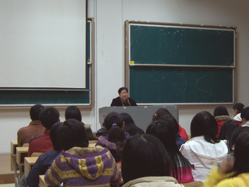 “爱与美是一切文学的生命”、“文学是心灵对美的召唤”,叶文玲以此开头,讲述了自己与文学将近半个世纪的不解情缘。她没有上过大学,却对文学有执着的热爱。她说,写作是她的内心生活的需要,是心灵对自我生命的询唤。在她的《写意浙江》等几部近年出版的散文集里,流淌着她对自己家乡的热爱和赞美。面对市场经济,叶老师仍然对文学的未来和人间的真情充满了信心。她以自己的经历告诉爱好文学的同学,“好的作品是改出来的”,并鼓励大家在当今投稿采用率低的情况下仍然要热爱专业,坚持文学创作。叶文玲还重点阐释了自己的新作《三生爱》,认为每一个读者都可以用自己的智慧和经验来充实一部作品。