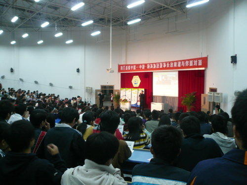 11月15日晚, A4-122报告厅聚满了闻讯赶来的800多名师生,第5期“握手企业家,引领新成长”优秀企业家进校园活动正在这里举行 ,颐高集团董事长翁南道与我校师生进行了一场别开生面的精彩交流。