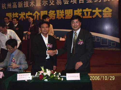 10月27日一11月2日,在2006中国浙江网上技术市场活动周中,由科技处的牵头,学校组织机械学院、电气学院、信息学院、生化学院、艺术学院、理学院、轻工学院有关教师参加了杭州高新技术展示交易会、第五届专家与中小企业家握手活动、大院名校浙江行等系列科技活动。在杭州高新技术展示交易会合作项目签约仪式上,我校轻工学院胡开堂教授就“高性能水性油墨的研发”和“素色纸的印刷”等项目与杭州临安福马装饰材料有限公司签订了合作协议。