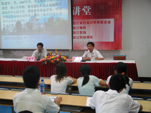 6月24日下午2:30分,浙江人文大讲堂小和山讲堂第三讲在我校隆重举行。华东师范大学中文系教授、博士生导师陈建华教授应邀作了题为《俄罗斯经典文学的魅力——从中国“俄罗斯年”谈起》的讲座,我校师生及社会各界人士聆听了本次讲座。讲座由校党委副书记胡浙平主持。胡浙平对陈建华教授能来我校人文大讲堂讲课表示感谢,也向省社联和钱江晚报对我校人文素质教育的支持表示感谢,并对我校师生提出了希望,希望进一步深入开展人文素质教育工作。