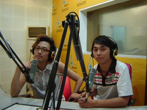 自5月下旬收到邀请以来,校党委宣传部十分重视,精心准备,联合校团委选拔校园主持人,并指导、帮助校园主持策划选题、准备文案、组织活动宣传海报。(图为校园主持李储成(右)与西湖之声导播田野做节目开播前的准备。)